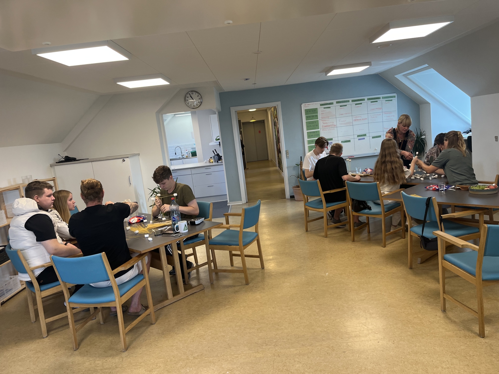 I tiden mellem 9.00 og 13.30/12.30 er der undervisning, hvor vi f.eks. laver mad, så der altid er frokost til dig, vi går i træningscentret, vi producerer håndarbejde - i øjeblikket lysestager og håndtasker, som vi sælger for at tjene penge til vores årlige studietur.
